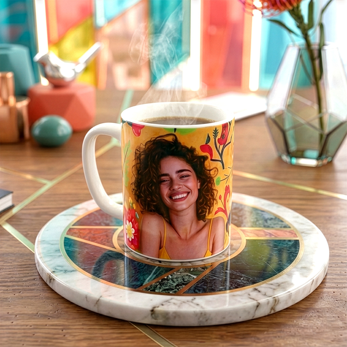 White cylindrical-shaped mug with coloured interior, on which a photo or image can be printed.