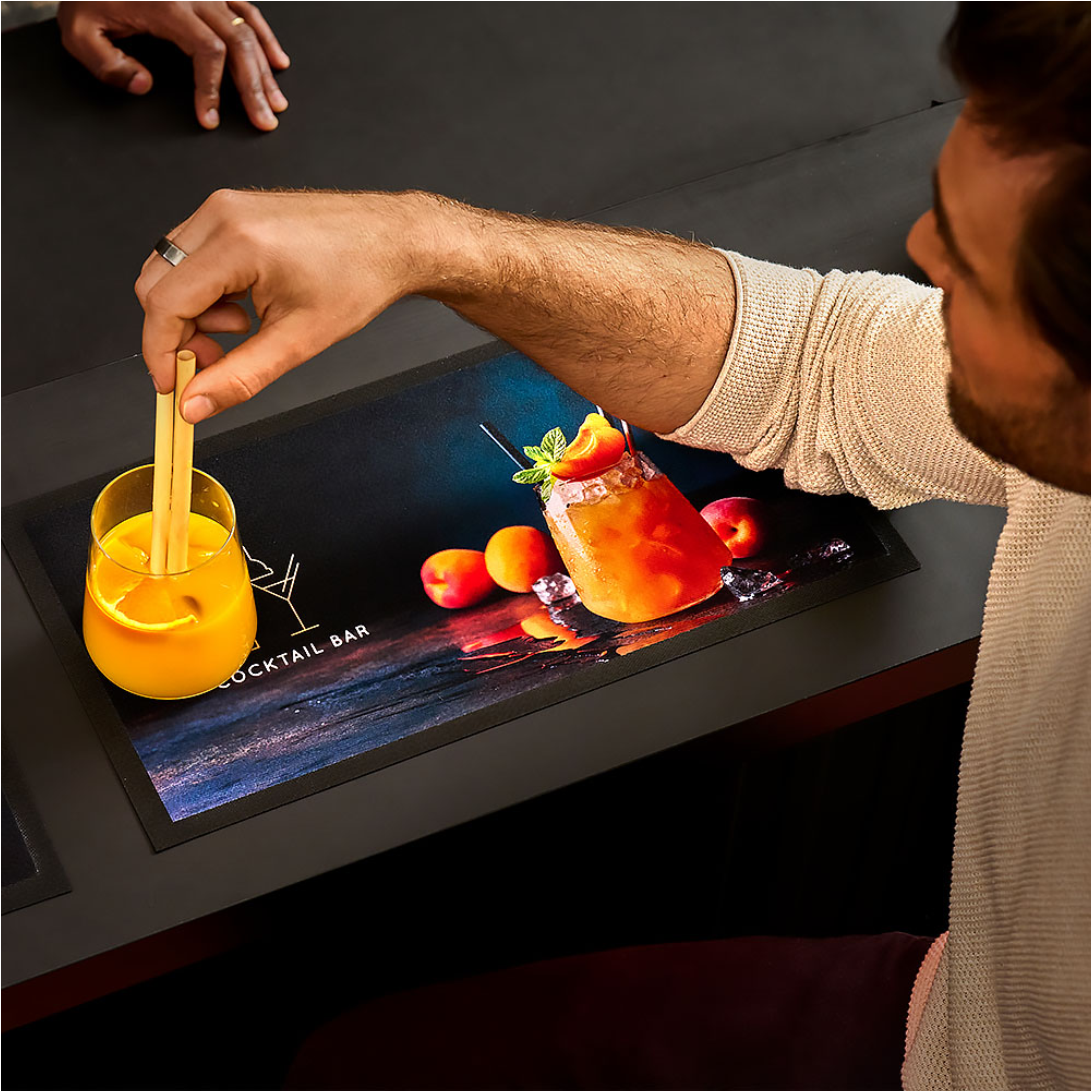 Our best-selling product for a reason – the Premium bar mat features a durable woven polyester surface that can be fully customised with Your chosen photographic-quality design to ensure excellent visibility in the bar. Available with or without edges, this mat offers flexibility based on Your needs. The polyester surface is durable, easy to clean, and does not wear out or stick with long-term use. It also provides excellent absorbency, keeping surfaces clean and safe. The mat is machine washable at up to 30 degrees and has been tested for durability and wear resistance. The material thickness is 0.09 cm, and the material weight is 1560 g/m².