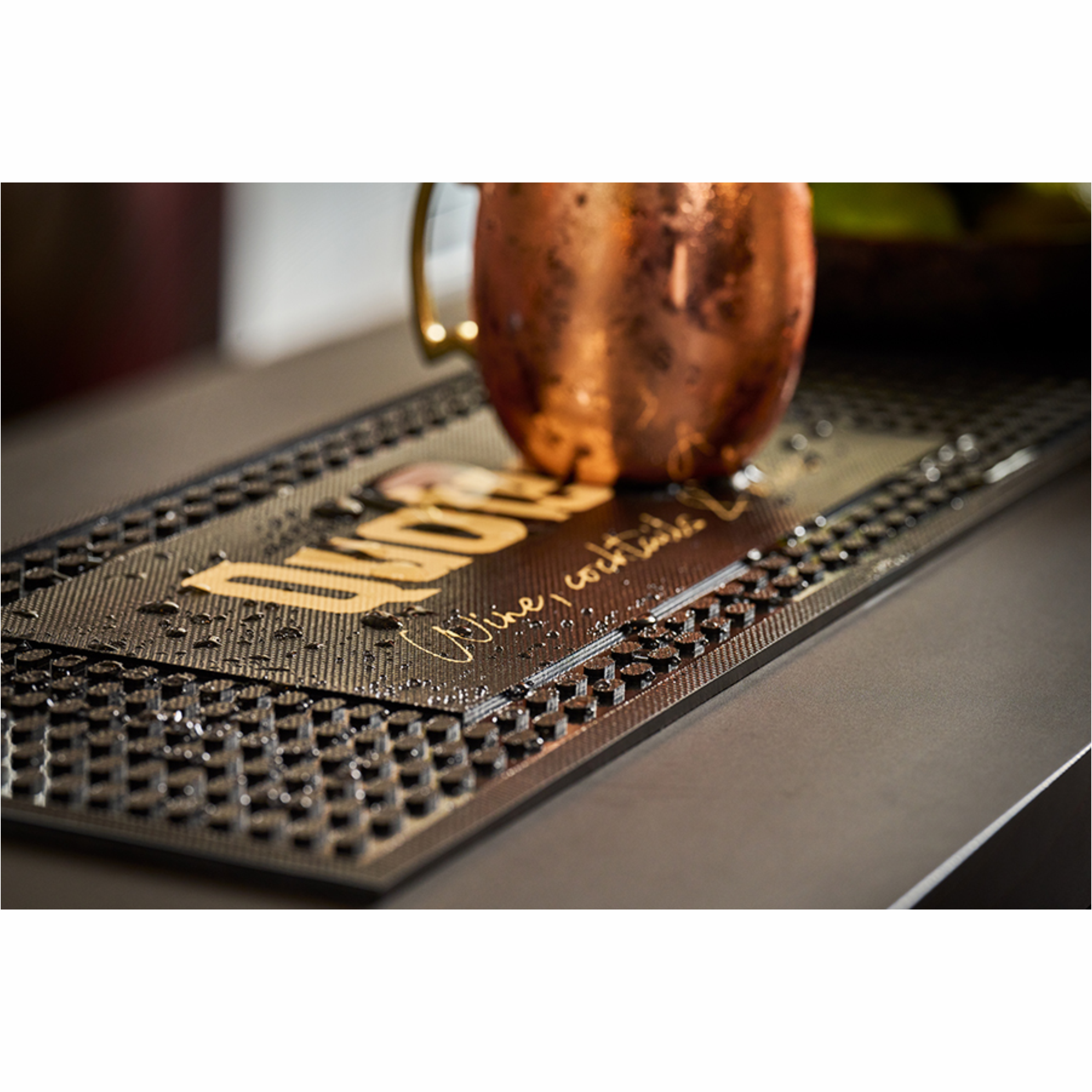 The Counter Impressions bar mat is our latest innovation for premium points of sale. Its full-colour printed, wipeable surface is combined with a highly functional groove design for collecting liquids. This mat offers outstanding visibility for any brand at the point of sale while protecting surfaces from spills. The grooved design provides extra protection against leaks, keeping countertops clean and safe. The easy-to-clean surface ensures the mat remains hygienic and practical. Additionally, the mat is durable, strong, and wear-resistant, and it is machine washable at up to 30 degrees. The material thickness is 0.4 cm. Bar mat total weight of the mat is 4800 g/m².