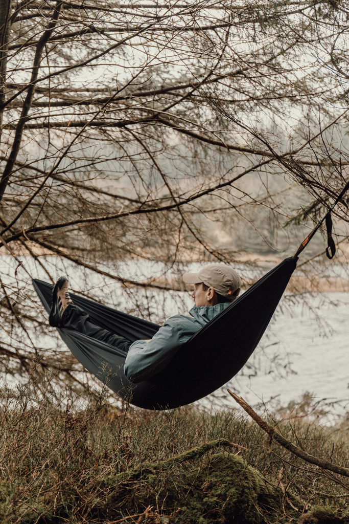Hammock is a lightweight and compact companion for outdoor adventures. Made from 44% GRS-certified recycled nylon, it packs neatly into its integrated pouch for easy carrying and storage. The spacious design is ideal for relaxing alone or together, while the sewn-in carabiner hooks and durable fastening straps make setup simple. When unfolded, the pouch works as a practical side pocket for small essentials. Instruction manual included. GRS-certified product. All Nordic Drift products are quality tested and come with a 5-year warranty against manufacturing defects.