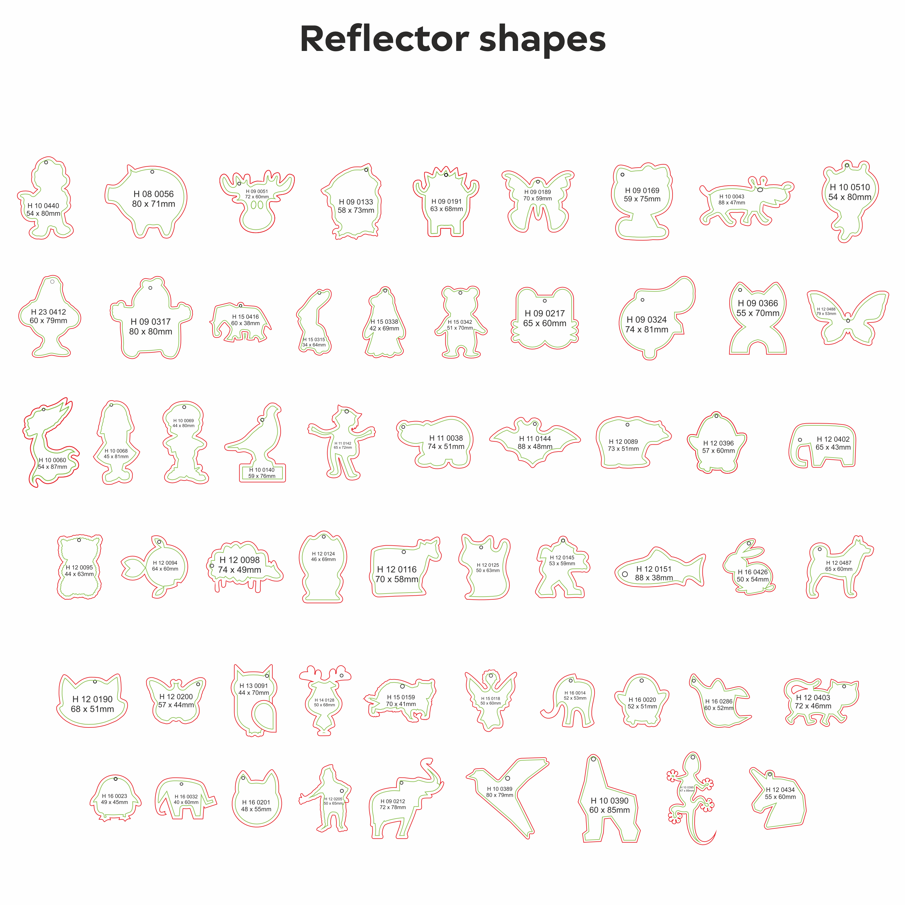 A hanging reflector designed in various animal shapes, options shown in the images. It is made from PVC by default, but you can opt for recycled TPU material, available in the „select an additional printing option„ dropdown menu. The reflector meets the European Union quality standard EN 13356:2001 and includes a user manual.