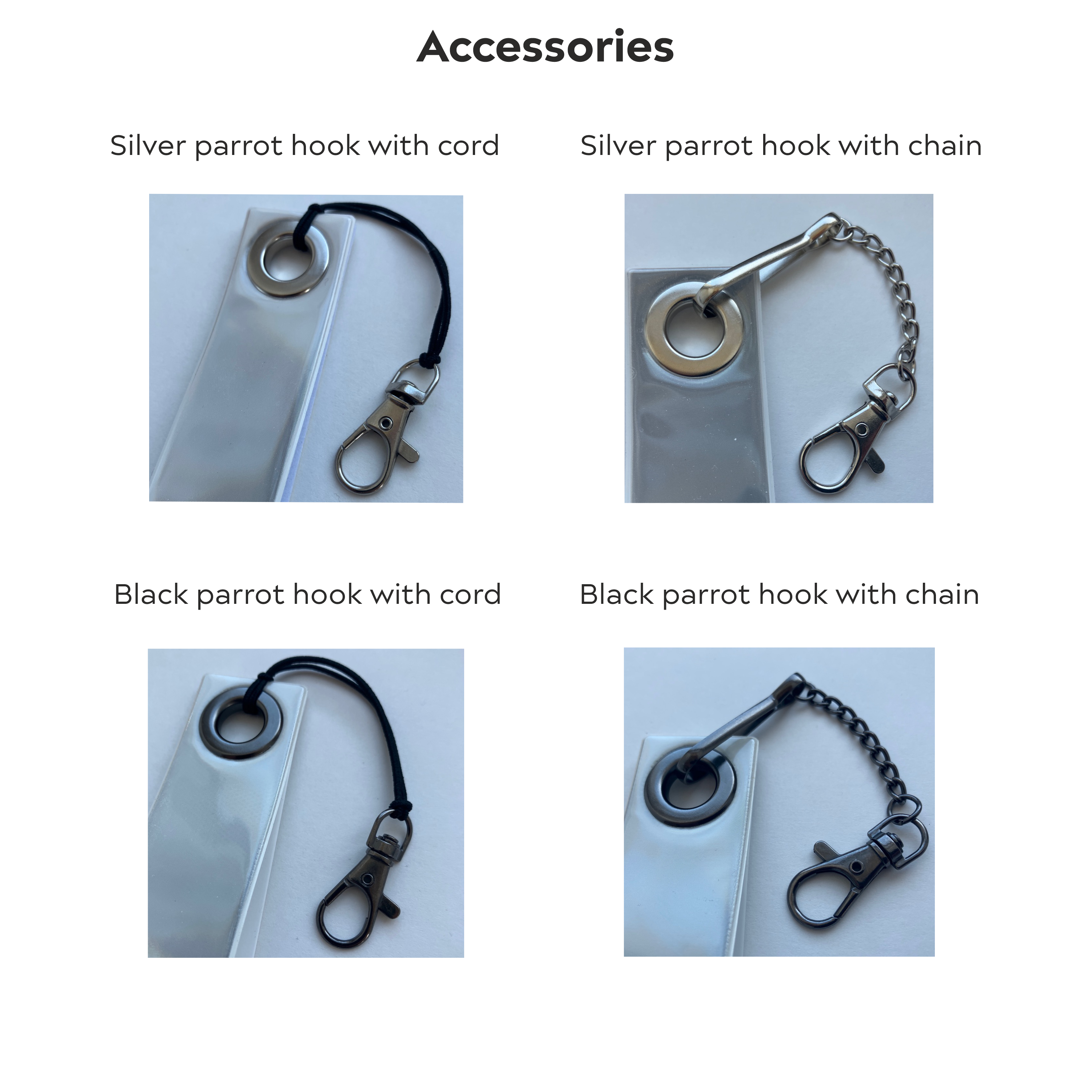 The selection of accessories can be found in the images – default is ‘silver parrot hook with cord’.