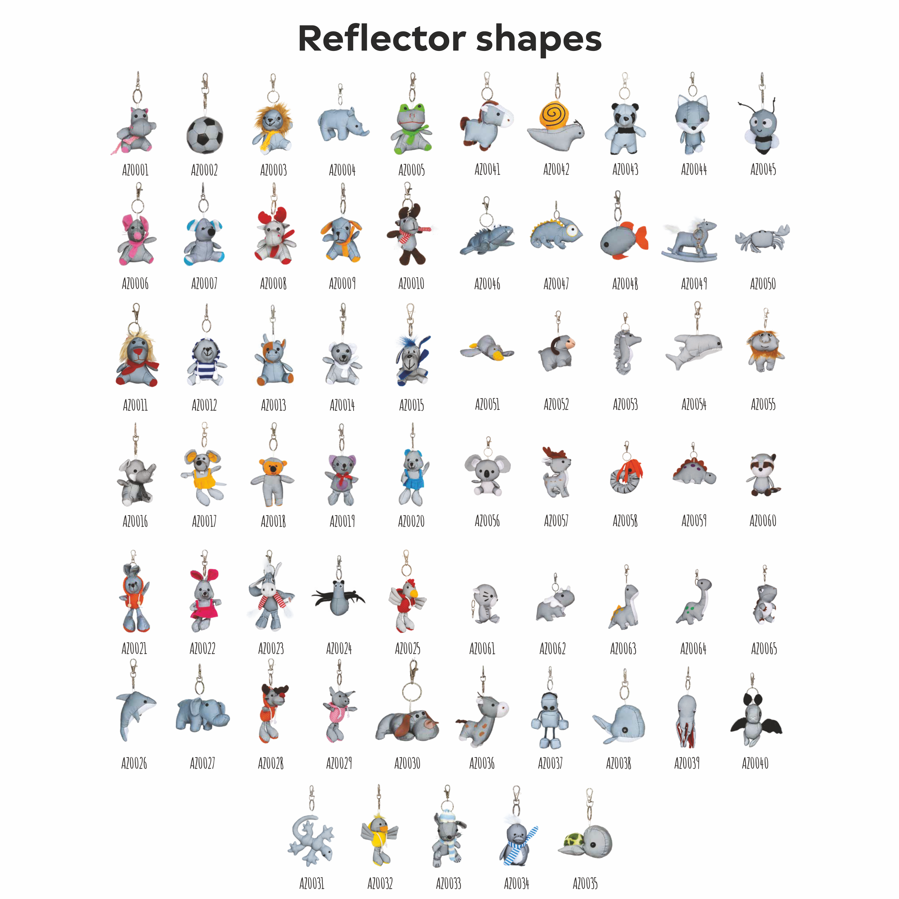 Reflector keychain with various animal-shaped designs, as shown in the images. The reflector is made from reflective fabric and features a parrot hook for easy attachment. The reflector meets the European Union quality standard EN 13356:2001 and includes a user manual.