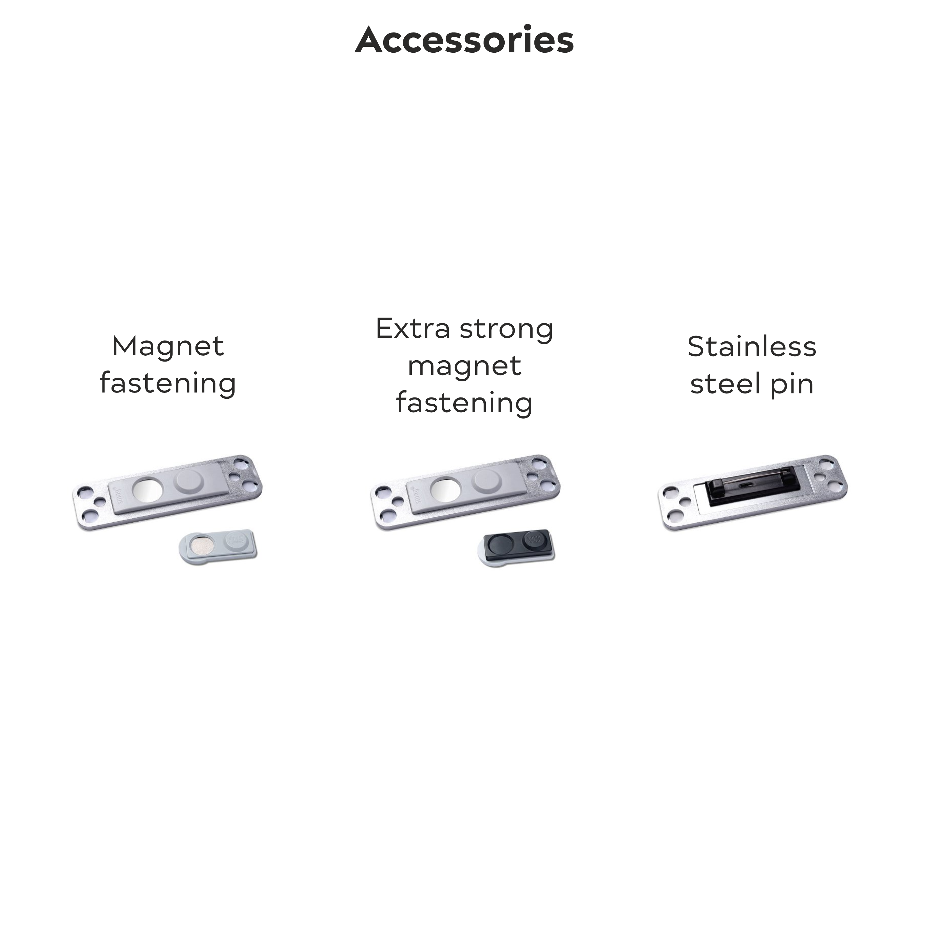 The selection of accessories can be found in the images – default is ‘magnetic fastening’.