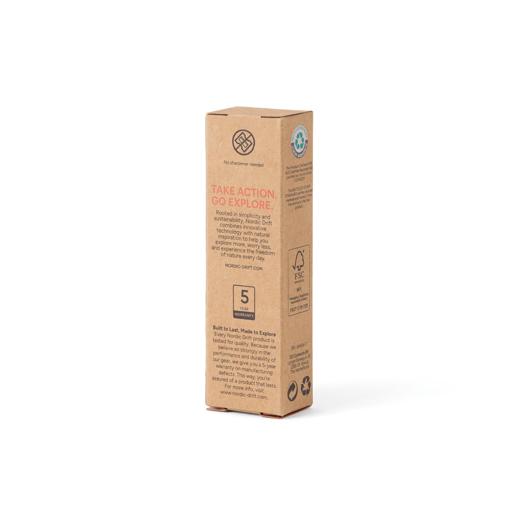 Harilik pliiats kauakestev on loodud õues kasutamiseks ja igapäevasteks seiklusteks. Grafiidiots liigub oranži nupu abil kirjutamiseks välja ja tõmbub kaitseks korpuse sisse tagasi. Ülaosas olev aas võimaldab selle seljakoti külge kinnitada, et see oleks alati käepärast. See kirjutab nagu tavaline pliiats, jälgi saab kustutada ja ots kulub aeglaselt, et tagada pikk kasutusiga. Valmistatud RCS-sertifikaadiga ümbertöödeldud ABS-ist ning ülaosas on väike kompass lihtsaks suuna määramiseks. Pakitud FSC-sertifikaadiga plastivabasse pakendisse. Kõik Nordic Drifti tooted on kvaliteeditestitud ja neil on 5-aastane garantii tootmisdefektide vastu.