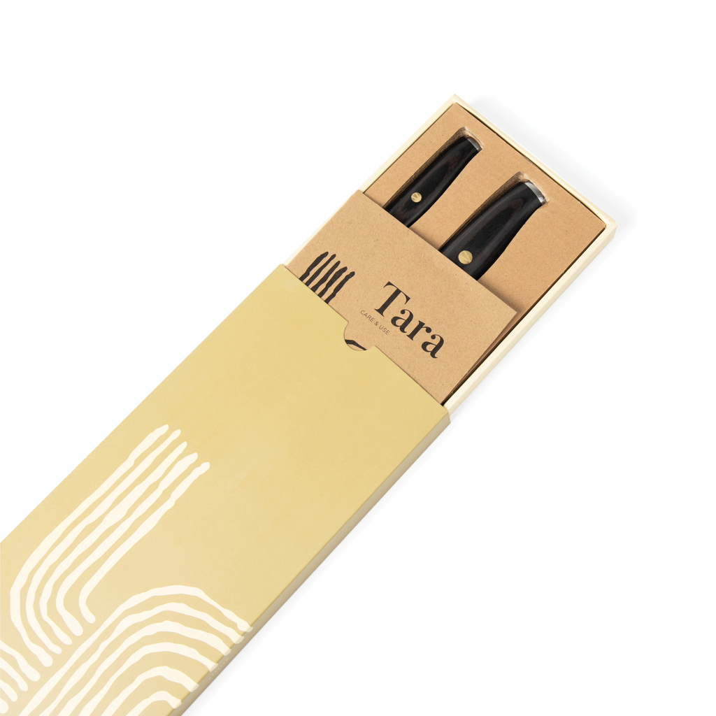 Tara Chef komplekt, valmistatud RCS-sertifikaadiga taaskasutatud roostevabast terasest, ühendab stiili ja mitmekülgsuse. Komplektis on suur 21 cm teraga kokanuga, mis sobib erinevateks köögitöödeks, ning lühikese teraga lõikamisnuga, mis on ideaalne täpsust nõudvate ülesannete jaoks. Noad on valmistatud kvaliteetsest 5Cr15Mov roostevabast terasest, pakkudes erakordset vastupidavust ja jõudlust. Kaunid pakkapuidust käepidemed tagavad mugava ja kindla haarde, samas kui tasakaalustatud disain muudab kasutamise lihtsaks. Komplekt sisaldab 23% RCS-sertifikaadiga taaskasutatud roostevaba terast. Pika eluea tagamiseks soovitatakse pesta ainult käsitsi.
