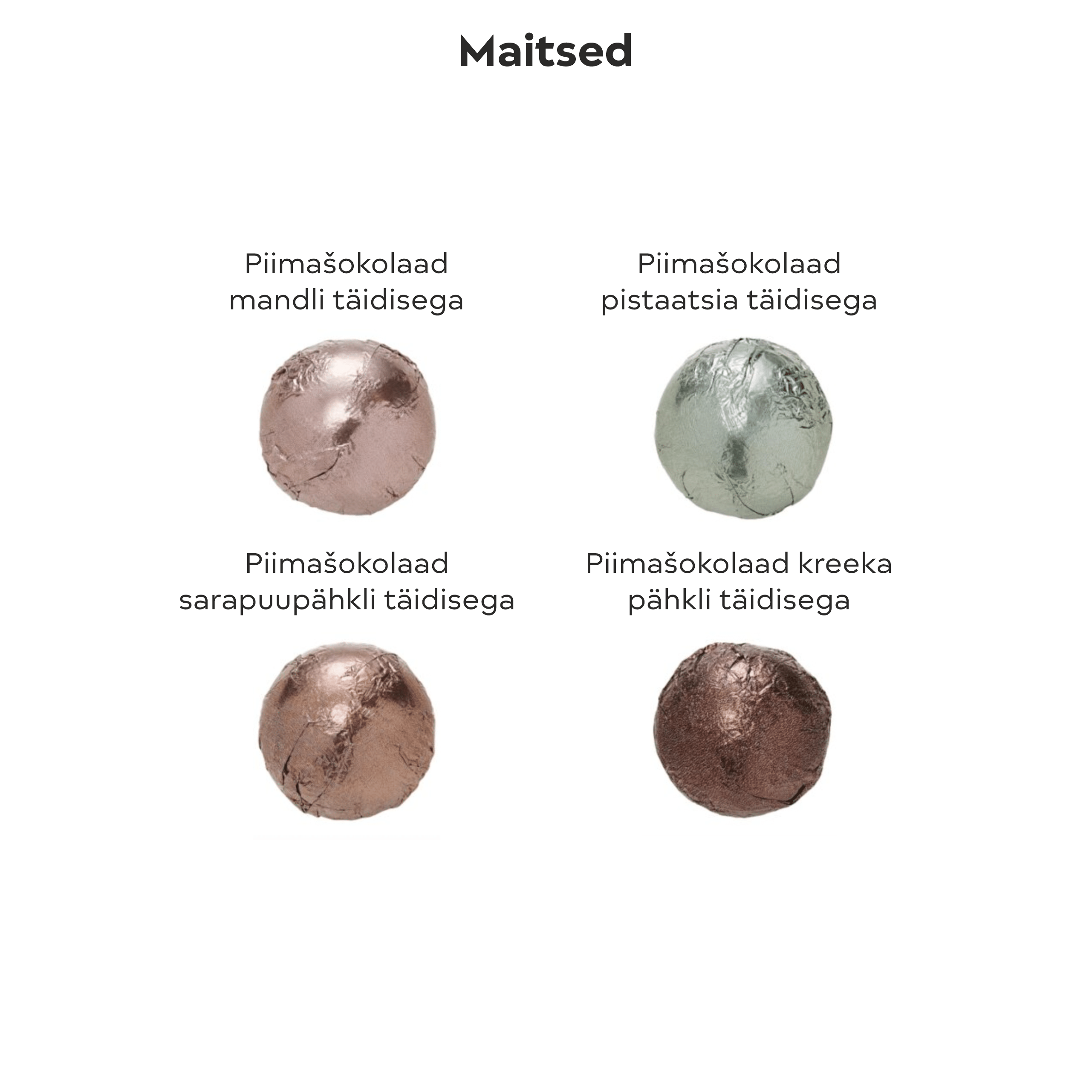 12 round chocolate pralines in a metal box with your design printed on it. Each flavor depicted in the image is represented by three pieces in the box.