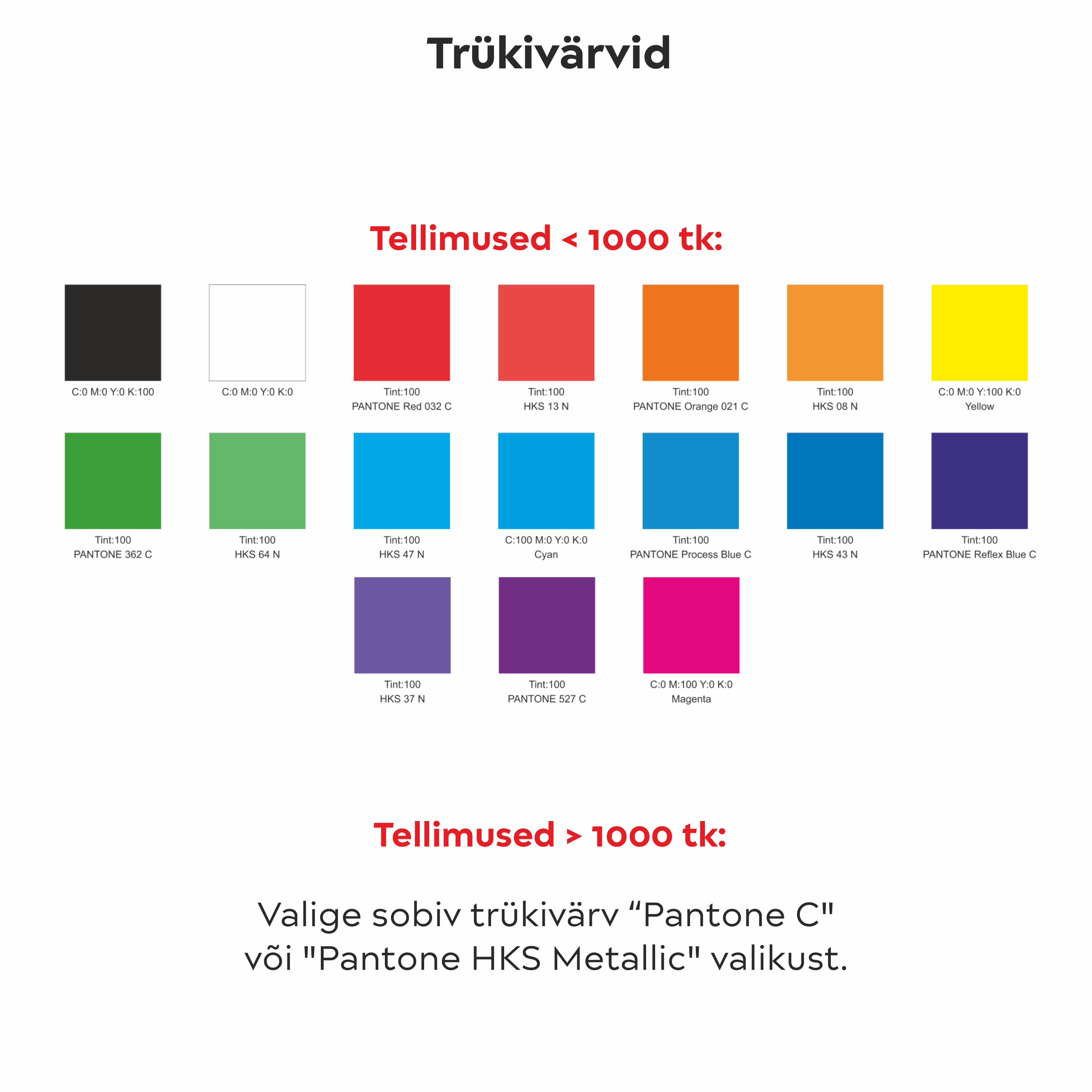 | Värv | akvamariinroheline, beebiroosa, must, sinine, erksinine, erkroheline, erkoranž, erkroosa, erkkollane, bordoopunane, tumesinine, tumeroheline, roheline, hall, mündiroheline, oranž, roosa, punane, türkiissinine, vaniljekollane, violetne, valge, kollane |