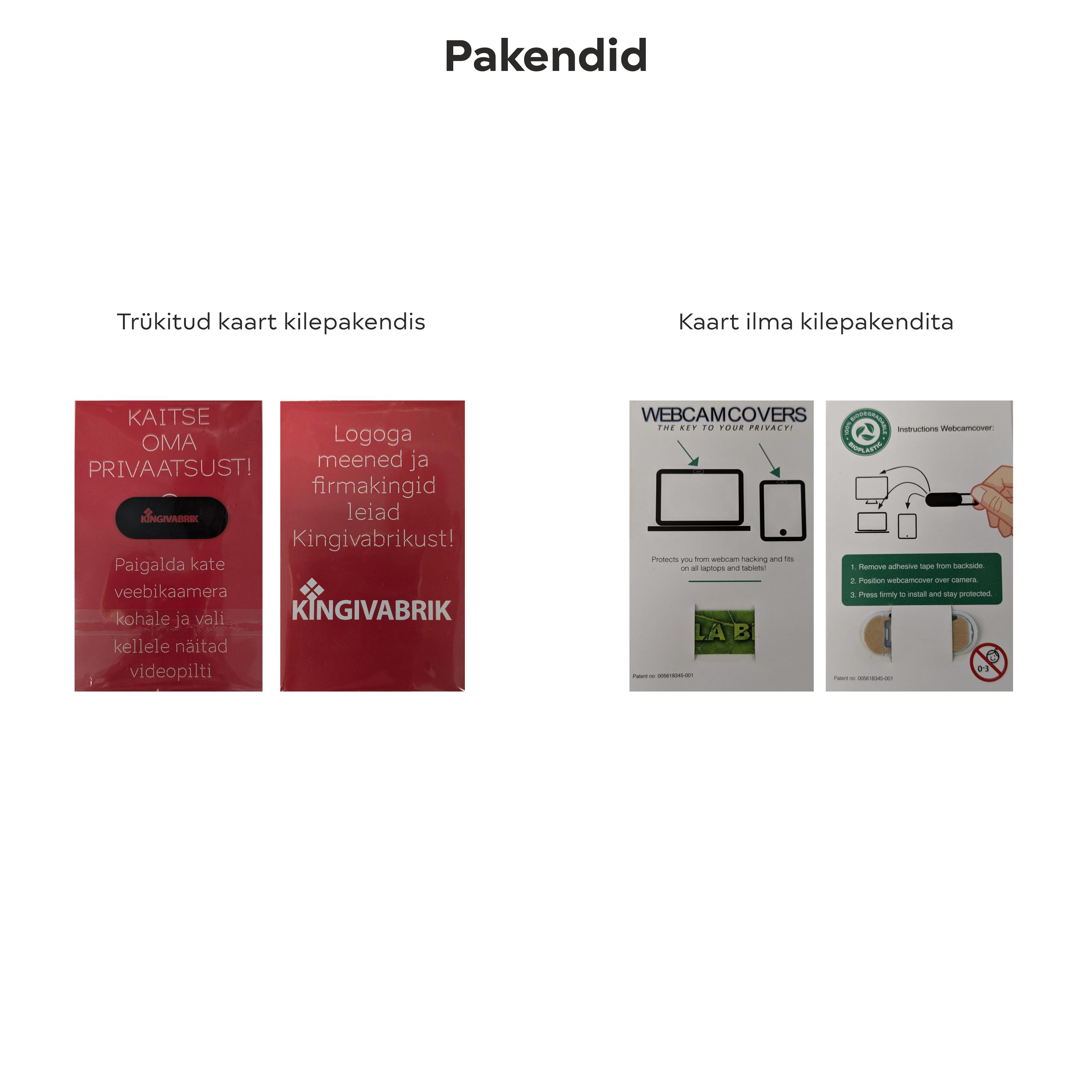 Tänapäeva digiajastul on privaatsuse kaitsmine olulisem kui kunagi varem. Viimased aastad on näidanud, et erinevad organisatsioonid ja isikud võivad saada loata juurdepääsu meie arvutitele ja salaja salvestada veebikaamera kaudu pilte ja videoid. Selle vältimiseks pakume veebikaamera katteid. Veebikaamera kate kinnitub arvuti külge 3M kleebisega, mis tagab kindla kinnituse ilma jääkaineteta eemaldamisel. Kaamera katet on lihtne avada ja sulgeda – liigutage kate vasakule, et avada kaamera, ja liigutage tagasi paremale, et see sulgeda. Pakendame toote spetsiaalsele kaardile, mille mõõtmed on 5.5 x 8.5 cm ja mida saab kujundada vastavalt teie brändingu soovidele. Slim veebikaamera kate on vaid 0.07 cm paksune, mistõttu ei tekita see sülearvuti sulgemisel mingeid probleeme. Kate kinnitub ekraani külge kahepoolse teibiga, mille paksus on kõigest 0,3 cm. See elegantne ja diskreetne kate on hädavajalik vahend, et kaitsta oma privaatsust ning samal ajal säilitada seadme funktsionaalsus.